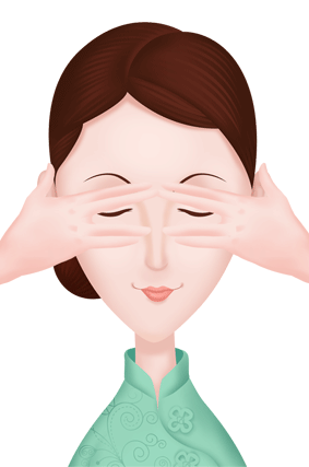 5、用中指和无名指轻轻按压睛明穴、承泣穴、瞳子髎,到太阳穴处。重复三次。