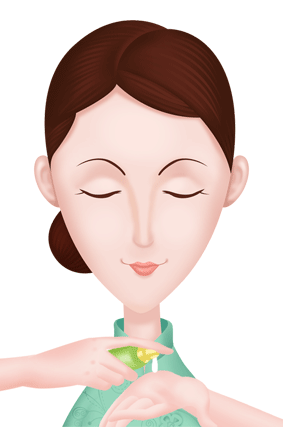4、额头部分,用中指以及无名指指腹,由眉心往左右两侧,以螺旋状轻轻按摩整个额头肌肤。