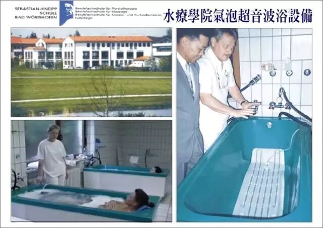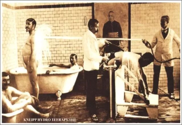 上图为19世纪末德国的克奈普水疗馆裡,一些向克奈普神父学习水疗技术的水疗师們正在为病人进行各种水疗方法。