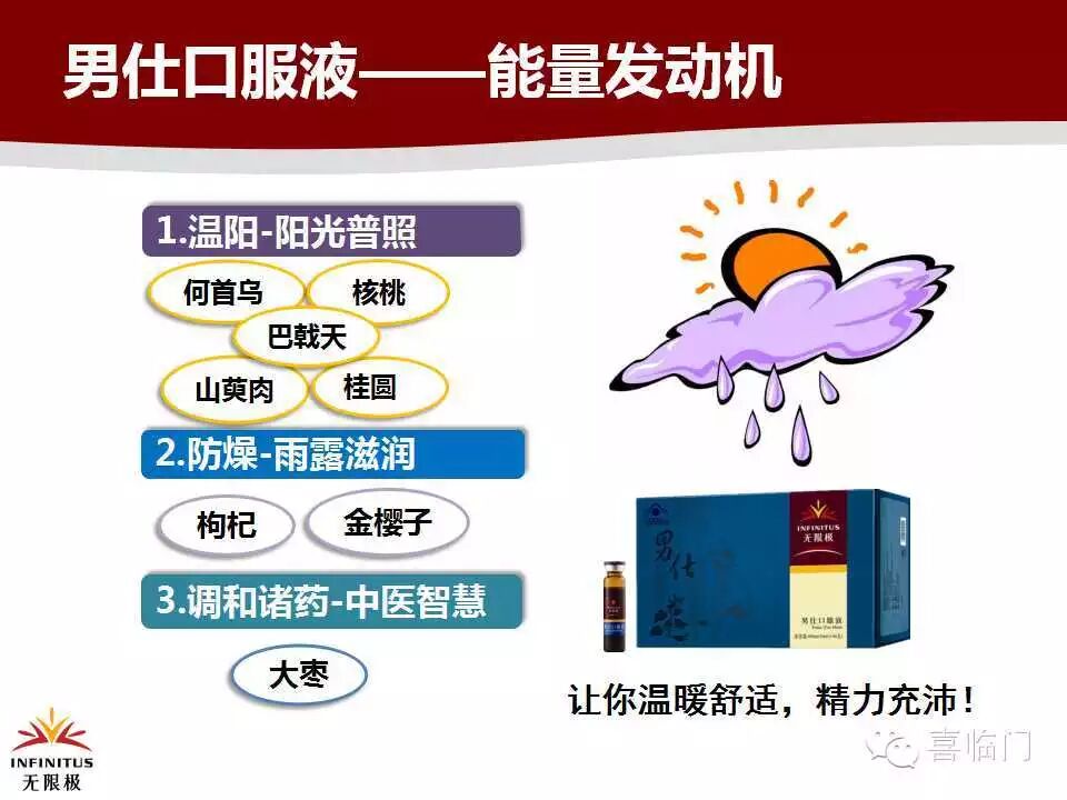 由于补肾阳的中药都偏温性,在配方设计时,如果搭配不当,容易温补太过,造成体内干燥不适,因此在温补肾阳时,中草药之间的科学配伍就显得十分重要。男仕口服液采用独特配方,温补肾阳,补而不燥,属于温补缓方。