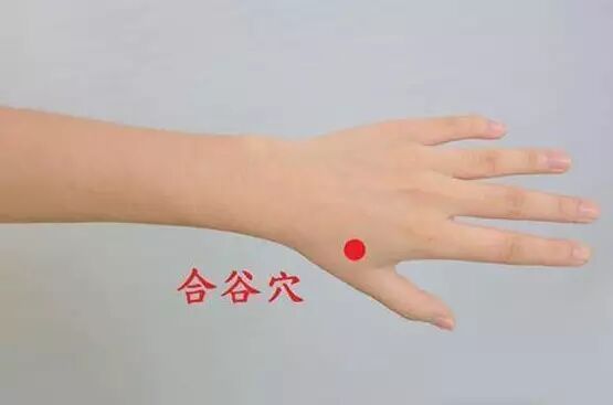 【合谷穴】:位于手背第1、2掌骨间,当第二掌骨桡侧的中点处,或以一手的拇指指骨关节横纹,放在另一手拇、食指之间的指蹼缘上,当拇指尖下就是合谷穴。