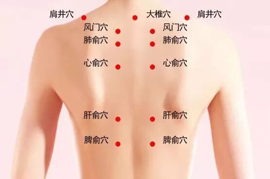 【肺俞穴】:位于背部第3胸椎棘突下旁开1.5寸处或左右旁开二指宽处。