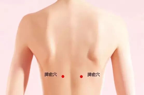 【脾俞穴】:位于背部第11胸椎棘突下,左右旁开两指宽处或旁开1.5寸处。