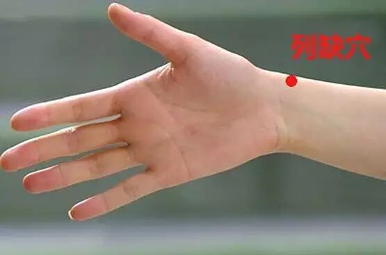 取穴方法:取此穴位时应正坐或仰卧,微曲肘,侧腕掌心相对,列缺穴位于手腕内侧(大拇指侧下),能感觉到脉搏跳动之处。