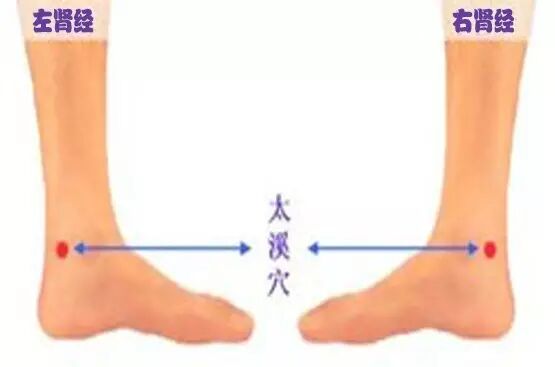 【太溪穴】:位于足内侧,内踝后方与脚跟骨筋腱之间的凹陷处。