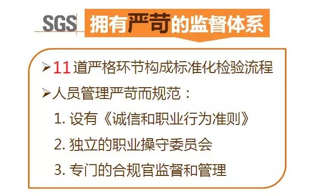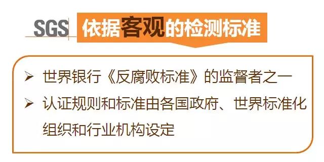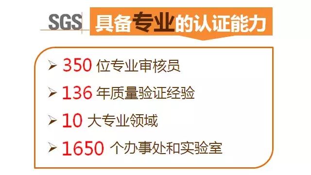 正是因为SGS的权威、专业、客观、严苛,全球50%的500强企业选择了与SGS合作,这些合作企业包括食品行业的达能、雀巢、亨氏,汽车行业的宝马、保时捷、奥迪、菲亚特,服务业的瑞士信贷、汇丰银行、美亚保