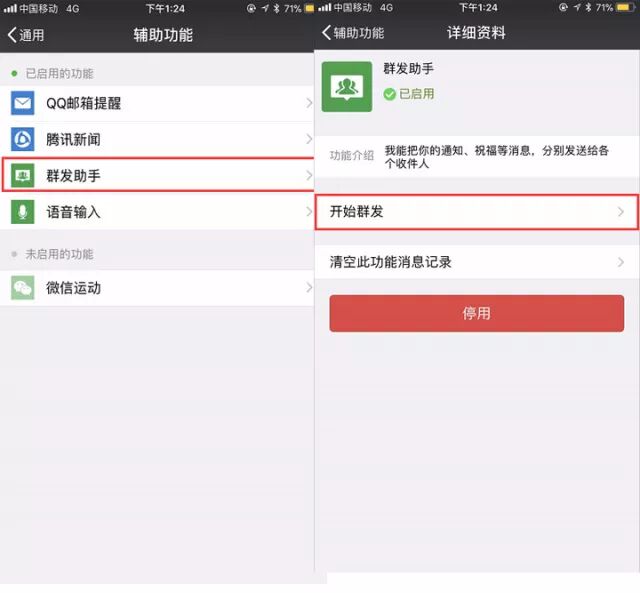 3、在“辅助功能”页面点击“群发助手”然后点击“开始群发”。