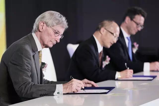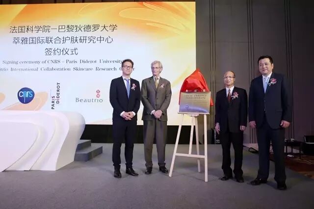 仪式上,双方签署了为期五年的合作协议,并邀请秦垂新先生、俞江林先生、DamienMARCHAL先生、Jean-Pierre BOISIVON先生共同为萃雅国际联合护肤研究中心揭牌,该牌将悬挂于法国科学院-巴黎狄德罗大学联合实验室及无限极研发中心。