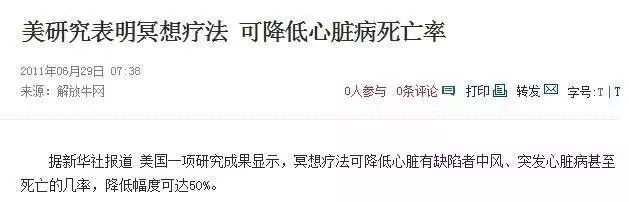 该研究在美国威斯康星医学院和马哈里希管理大学自然医学和预防研究所展开。经过9年跟踪比对,研究人员发现,练习“冥想”的研究对象血压、自身压力和愤怒感显著降低,中风、突发心脏病甚至死亡的几率下降了47%。